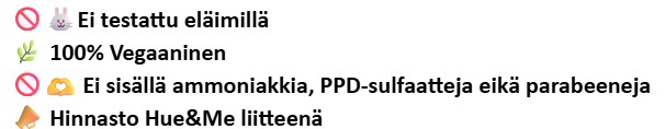 Ajoitus on täysin valinnainen Hue&Me:ssä. Mitä pidempään jätät väripigmenttimaskin hiuksiisi, sitä voimakkaammat väritulokset ovat ja voit odottaa enemmän sidekorjauksia ja parantunutta kuntoa. On suositeltavaa jättää Hue & Me:n hiuksiin 5–30 minuutiksi. Hue&Me kestää 4–6 viikkoa riippuen säännöllisestä hoitorutiinistasi. Esimerkiksi mitä useammin peset hiuksiasi, sitä nopeammin tuloksesi haalistuvat.